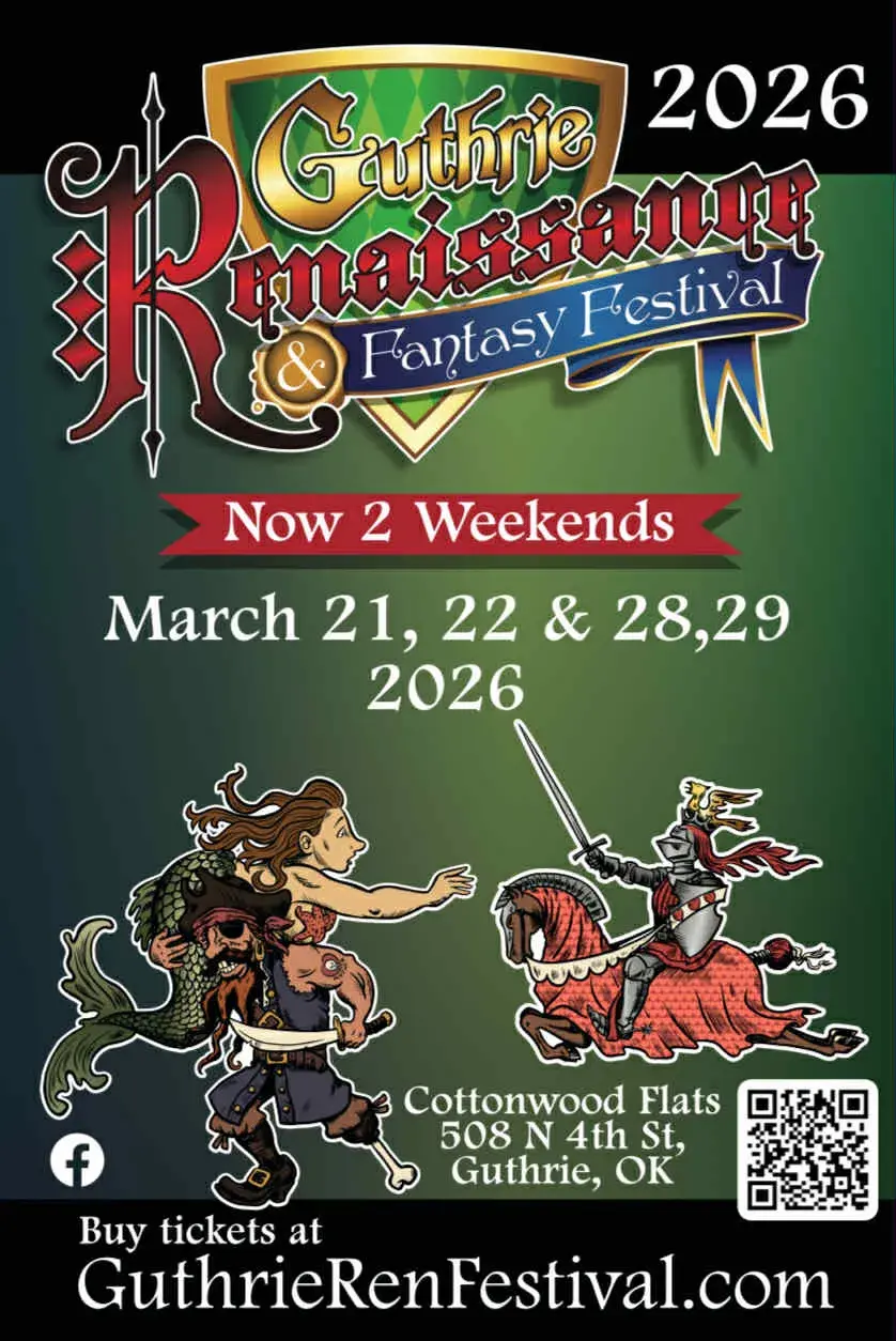 Guthrie Renaissance & Fantasy Festival is kicking off its 5th year with the exciting addition of a second weekend! Because of the incredible support the festival has received, it is proudly expanding to two full weekends—March 21-22 and March 28-29, 2026. Of course, this means twice the magic, merriment, and chances to lose yourself in Oklahoma’s most creative and immersive Renaissance experience. Immerse yourself in a world of jousting and sword- wielding knights, joking jesters, parading pirates, and very intimidating Vikings—just to scratch the surface. A trip to historic Guthrie is always a step back in time, but a trip to the Guthrie Renaissance & Fantasy Festival is a giant leap into lost worlds, both real and imagined.